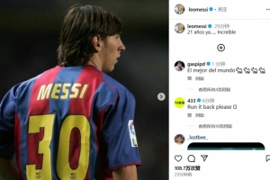 梅西發(fā)布了一張他身穿巴薩30號(hào)球衣的經(jīng)典舊照,并配文寫道:“已經(jīng)21年了……難以置信?!?/p>