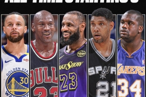 他們分別是:?jiǎn)痰?、詹姆斯、庫里、奧尼爾、鄧肯。