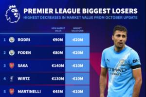 體育資訊10月17日訊 德轉(zhuǎn)更新英超身價,其中跌的最多的是羅德里和福登,他們身價都下降了2000萬歐。