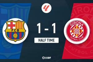上半場(chǎng)補(bǔ)時(shí)2分鐘,巴薩1-1赫羅納。