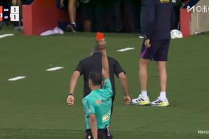 比賽補(bǔ)時(shí)階段,弗里克不滿裁判,兩黃變一紅被罰下,他將無緣下輪的國家德比。
