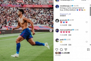 賽后阿勞霍也在社媒曬出進球后脫衣慶祝的照片,配文寫道:“永遠拼盡全力并堅持到最后一刻,加油巴薩!”