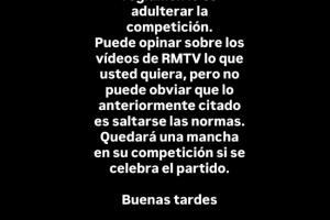 卡瓦哈爾:你好,特巴斯先生。違反規(guī)定就是玷污比賽。你可以對(duì)此前皇馬TV發(fā)布的視頻發(fā)表你想要說(shuō)的任何意見(jiàn)。但你不能否認(rèn)之前所提到的內(nèi)容(海外賽)就是違反了規(guī)則。如果進(jìn)行海外賽,你的比賽就會(huì)有污點(diǎn)。