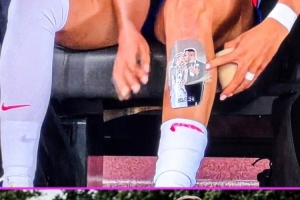 比賽中,鏡頭捕捉到在替補(bǔ)席做準(zhǔn)備的凱莉護(hù)腿板上印著她與丈夫斯科特-摩爾在婚禮上接吻的畫面,兩人于一年前完婚。