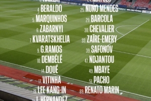 前鋒:7-克瓦拉茨赫利亞、9-貢薩洛-拉莫斯、10-登貝萊、14-杜埃、19-李剛?cè)省?9-巴爾科拉、47-恩賈恩圖、49-姆巴耶