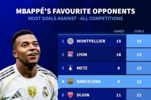 體育資訊10月27日訊 皇馬在本輪西甲焦點戰(zhàn)2-1力克巴薩,姆巴佩取得進球?!掇D會市場》統(tǒng)計顯示,巴薩也是姆巴佩生涯各項賽事進球第4多的對手。