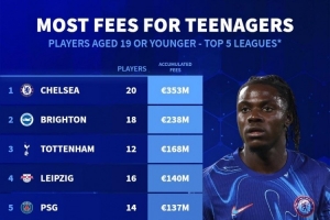 體育資訊7月20日訊 德國轉(zhuǎn)會(huì)市場(chǎng)統(tǒng)計(jì)了21-22賽季以來五大聯(lián)賽俱樂部引進(jìn)U19(包含19歲)球員的總費(fèi)用,并列出榜單,切爾西居首,布萊頓、熱刺二三位。
