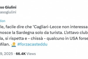 朱利尼寫道:“親愛的卡迪納萊,當(dāng)你對(卡利亞里主場所在地)撒丁島的了解僅限于游客視角時,說‘沒人關(guān)心卡利亞里對陣萊切的比賽’會很容易。作為意大利球迷數(shù)量排名第八的俱樂部,卡利亞里既有觀眾關(guān)注,也備受尊重。而且誰知道呢,在美國,或許支持卡利亞里的人比支持米蘭的還多(注:在美國有很多來自撒丁島移民的后裔)。”