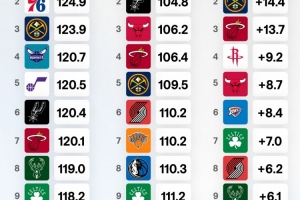 Net Rating(凈效率):是進(jìn)攻效率減去防守效率,即球隊(duì)每100個(gè)回合凈勝對手的分?jǐn)?shù)。這是最能反映一支球隊(duì)整體實(shí)力的指標(biāo)。