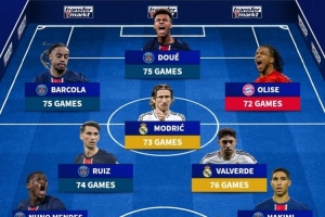 體育資訊7月21日訊 德國轉(zhuǎn)會市場統(tǒng)計了球員上賽季的出場次數(shù),并列出了出場最多陣容,巴爾韋德、莫德里奇、阿什拉夫在列,巴黎5名球員入選。