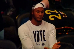 此役,雄鹿中鋒邁爾斯-特納重返步行者主場,但遭到老東家球迷的漫天噓聲,對此,特納面對鏡頭做了一個(gè)合上書的動(dòng)作。