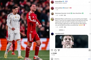 麥卡在進(jìn)球后比出“A”字母慶祝的動(dòng)作,也被很多人視為對(duì)阿諾德的“貼臉開大”,因?yàn)檫@和阿諾德的慶祝幾乎一模一樣。