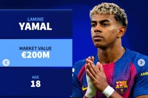 體育資訊11月9日訊 《轉會市場》統(tǒng)計了16歲到25歲的各年齡最高身價情況,18歲亞馬爾2億歐居首。