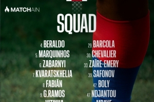 中場:8-法比安、17-維蒂尼亞、24-馬尤盧、33-扎伊爾-埃梅里、87-若昂-內(nèi)維斯