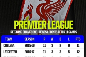 體育資訊11月10日訊 在本輪英超,利物浦0-3不敵曼城,11輪過(guò)后只得到18分,OPTA也盤點(diǎn)了英超歷史衛(wèi)冕冠軍在前11輪過(guò)后最少積分情況,本賽季利物浦排在第四,具體如下: