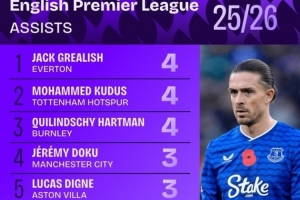 本賽季英超助攻榜:格拉利什、庫(kù)杜斯、哈特曼4次并列居首