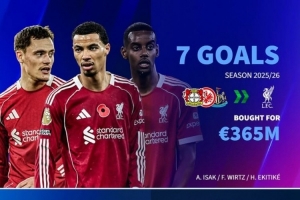 利物浦在今夏共計花費3.65億歐元基礎(chǔ)轉(zhuǎn)會費引進了維爾茨(勒沃庫森)、?;倏耍ǚㄌm克福)、伊薩克(紐卡斯?fàn)枺?人至今共計貢獻7球5助攻。