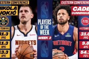 體育資訊11月11日訊 今日NBA官方宣布,活塞球星康寧漢姆和掘金球星約基奇當(dāng)選本賽季第3周東、西部最佳球員。