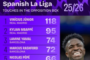 本賽季西甲在對方禁區(qū)內(nèi)觸球榜:維尼修斯118次居首,姆巴佩第二