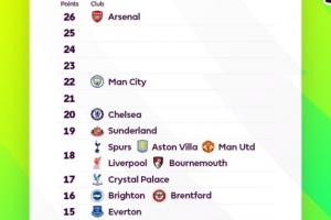 體育資訊11月12日訊 英超官方曬圖英超的“積分榜”,這份榜單以積分為序號,不以排名列出。