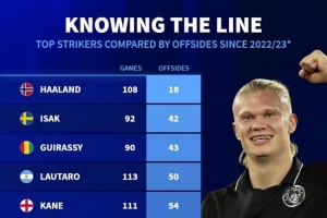 體育資訊11月12日訊 德國轉會市場統(tǒng)計了2022-2023賽季以來頂級前鋒(中鋒)在聯(lián)賽中的越位次數(shù),哈蘭德18次最少,C羅143次最多。