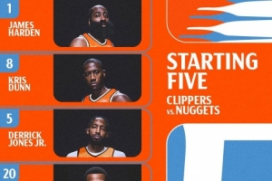 賽前快船公布了本場(chǎng)首發(fā):哈登、鄧恩、小德里克·瓊斯、科林斯、祖巴茨。