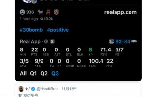 本場比賽,庫里轟下46+5+5;在昨日被雷霆暴揍的比賽中,一位叫HoodiiBron的網(wǎng)友曬出庫里的數(shù)據(jù)截圖,并表示:“退役吧兄弟?!?/p>
