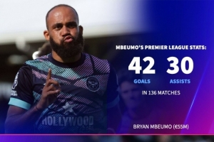 數(shù)據(jù)統(tǒng)計顯示,姆貝莫136場英超貢獻42球30助攻,庫尼亞82場英超貢獻29球13助攻。