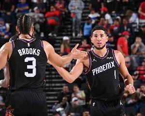 布克出戰(zhàn)29分鐘,投籃22中12,三分球10中3,罰球6中6,轟下33分5籃板7助攻的數(shù)據。