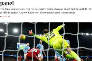 誤判!泰晤士報(bào):英超專家組裁定,范戴克對(duì)曼城進(jìn)球應(yīng)判有效