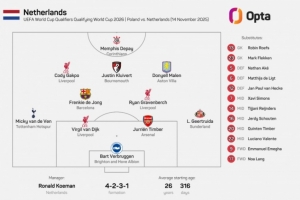 體育資訊11月15日訊 世預(yù)賽歐洲區(qū)小組賽,荷蘭前往客場(chǎng)挑戰(zhàn)波蘭。本場(chǎng)比賽,荷蘭排出的首發(fā)陣容中沒(méi)有任何一名意甲球員,2018年9月9日以來(lái)的正式比賽首次出現(xiàn)如此局面。