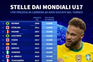 體育資訊11月15日訊 德轉(zhuǎn)列出了曾參加U17世界杯球員最高身價排名,內(nèi)馬爾1.8億歐居首,斯特林1.6億歐次席。