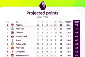 體育資訊11月15日訊 本賽季英超已經(jīng)過去11輪,阿森納8勝2平1負,積26分排名聯(lián)賽第1,領先第二的曼城4分。