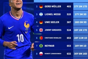 1、姆巴佩(537場):26歲10個(gè)月24天