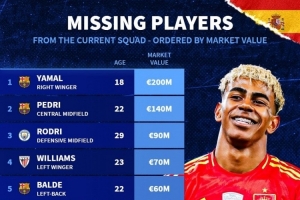 體育資訊11月16日訊 德國轉(zhuǎn)會市場統(tǒng)計了無緣本期西班牙隊球員身價,并列出榜單,亞馬爾2億歐居首。