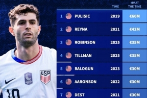 體育資訊11月16日訊 德國轉(zhuǎn)會市場盤點了美國球員歷史身價排名,2019年的普利西奇以6000萬歐元排名第一。