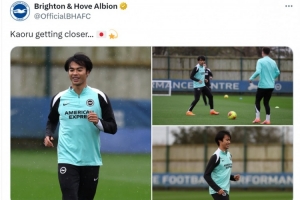 布萊頓社媒曬出三笘薫的照片,確認這位日本攻擊手恢復訓練,配文:“三笘薫距離復出更近了?!?/p>